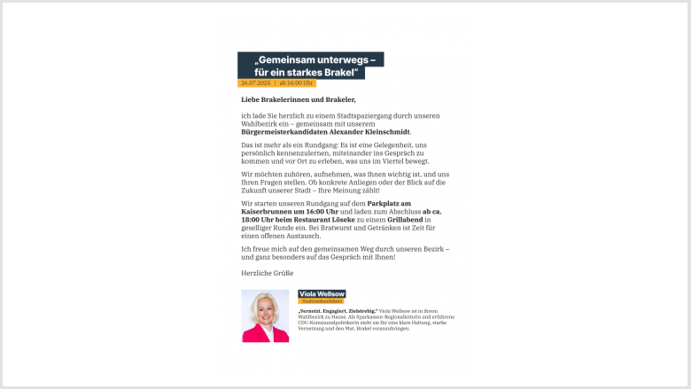 Der CDU-Stadtverband Brakel lädt herzlich ein zum Stadtteil-Spaziergang mit Bürgermeisterkandidat Alexander Kleinschmidt